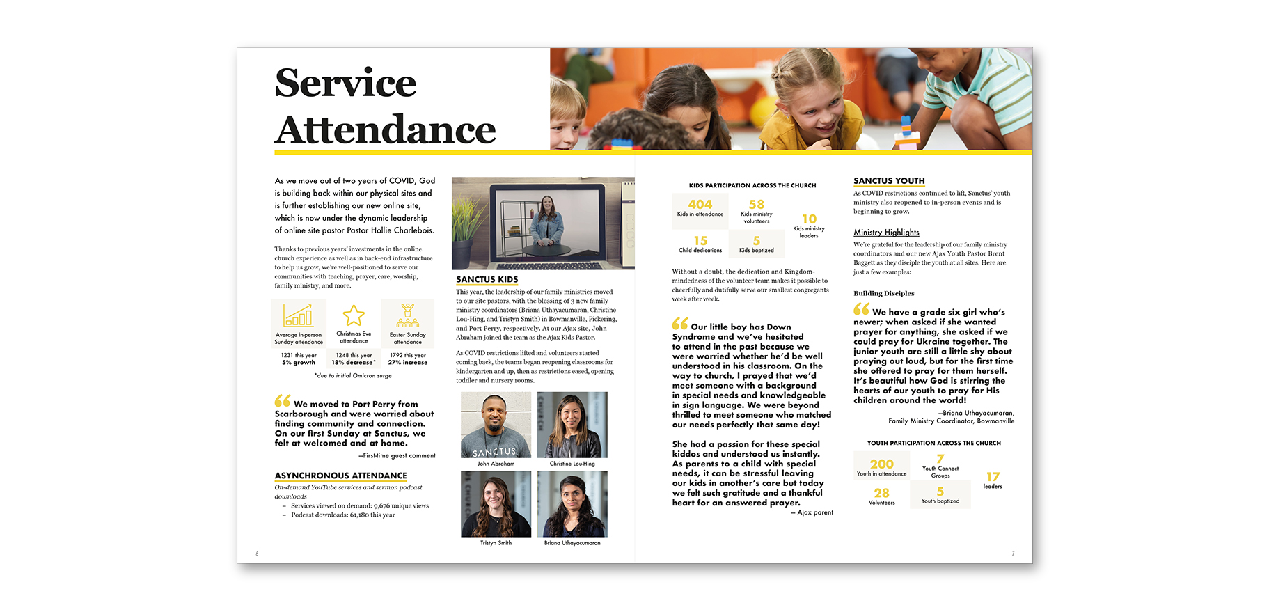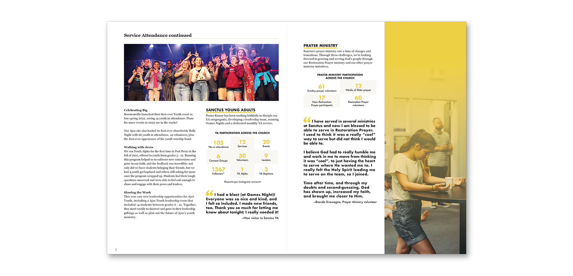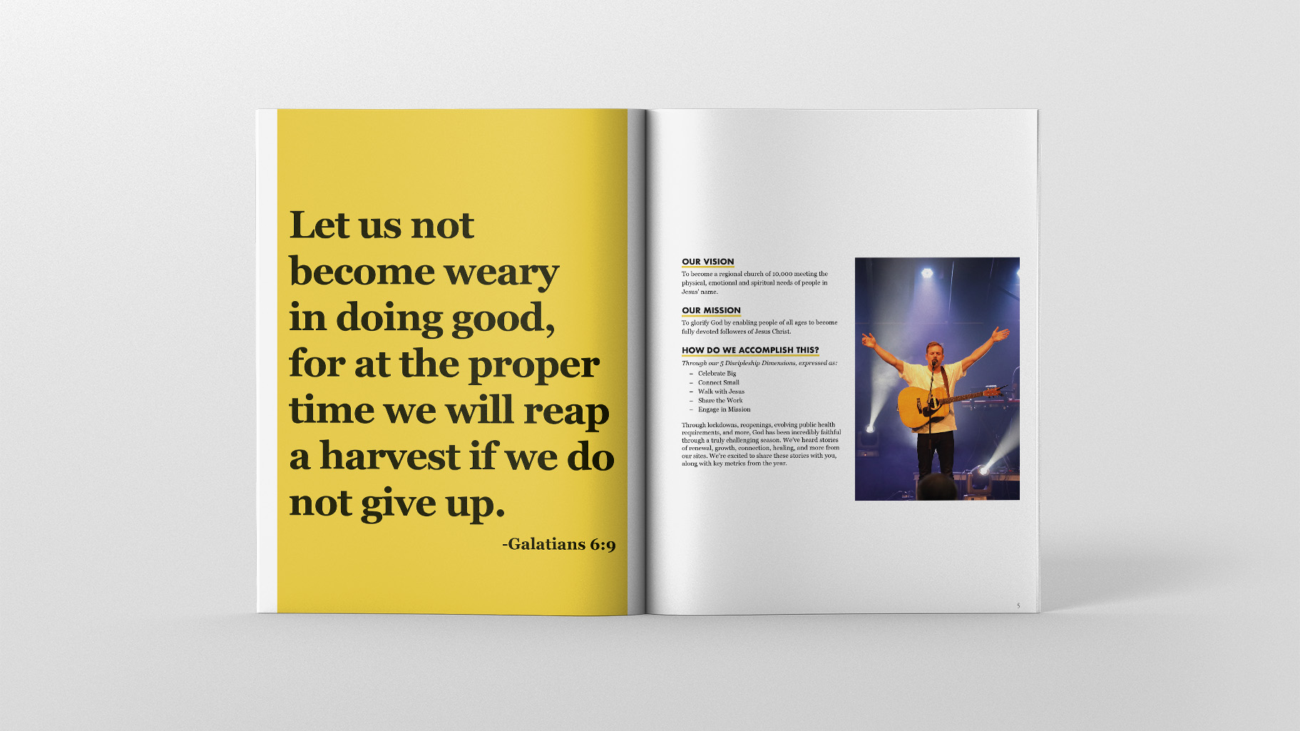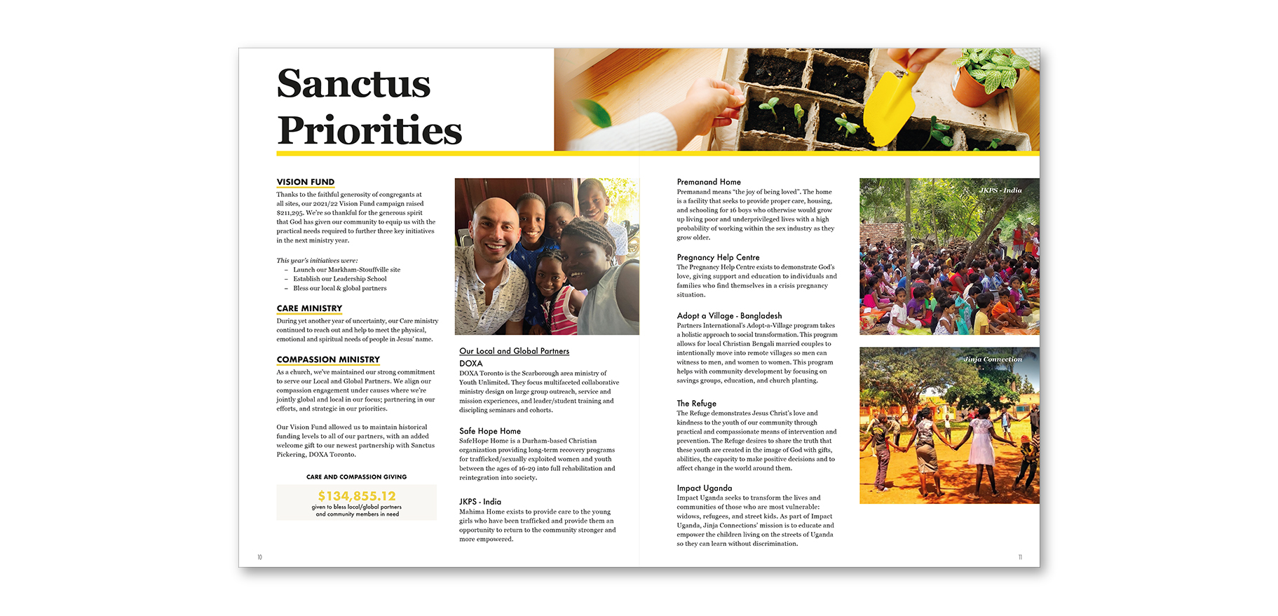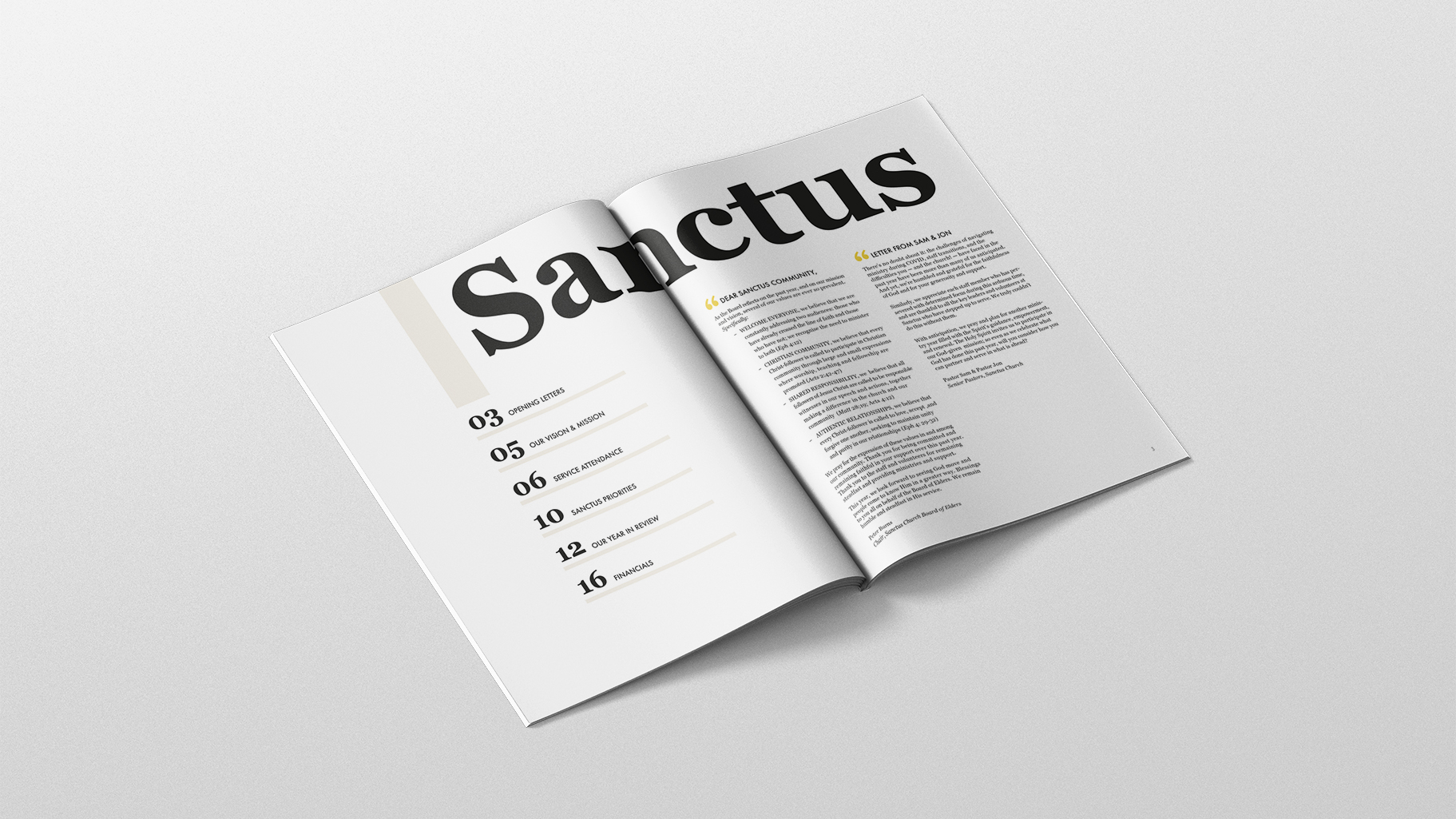 Designed an annual report for Sanctus Church that guides their audience through the successes and highlights of the previous year and showcases future organizational vision.